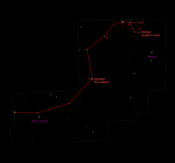 This constellation is associated with the Lernean Hydra, slain by Heracles. As one head was removed, two took its place. He eventually cauterized each severed neck to keep the heads from regenerating, until he reached the final, immortal head. This was buried under a rock. Stars - Epsilon hydrae is a triple star system, two components may be resolved in amateur telescopes . Deepsky - The “Ghost of Jupiter” is an 8th magnitude planetary nebula low down in altitude and best seen with a telescope of aperture 6" or greater. More accessible is M48, a 6th magnitude open cluster which is easily visible in binoculars. Visibility - Although the whole of Hydra is not visible from the UK, the best time to view it is April. |