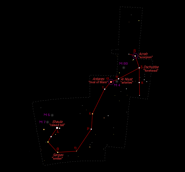 | Mythology - When Orion boasted to the gods that he had killed every wild creature on Crete, Apollo sent a scorpion to kill him. Although this didn't work directly, Orion ended up chasing the scorpion into the sea where he was killed by an arrow fired by Artemis, wrongfully thinking his head was a log. The gods placed Orion and the scorpion on opposite sides of the sky so they would never be above the horizon at the same time. As Orion rises, Scorpius sets and vice-versa. According to South Pacific mythology, the great god Maui brought forth the islands from the sea using a giant fishhook. This constellation represents that fishhook and is often worn round the neck by antipodeans. Stars - Look for the baleful red glare of Antares the heart of the Scorpion. Sometimes when Mars moves through Scorpius it can be difficult to tell these two apart. This is an example of a red supergiant star with a diameter of about 4 A.U.s. Telescopes show it to be embedded in a cloud of glowing gas and dust. Acrab (beta scorpii) is a good double star for modest telescopes. Deepsky - Scorpius is a good hunting ground for clusters. Binoculars will allow you will find the bright globulars M4 and M80 but these are rarely seen very high above the horizon. Even lower down are two galactic clusters M6 and M7 (just above the sting), but these are out of sight for UK observers. Visibility - UK observers will not see the whole of Scorpius, it will get cut off below epsilon scorpii, but holidays may take you to places in Europe where the whole of the tail can be seen. The best time to see Scorpius is in July and August |